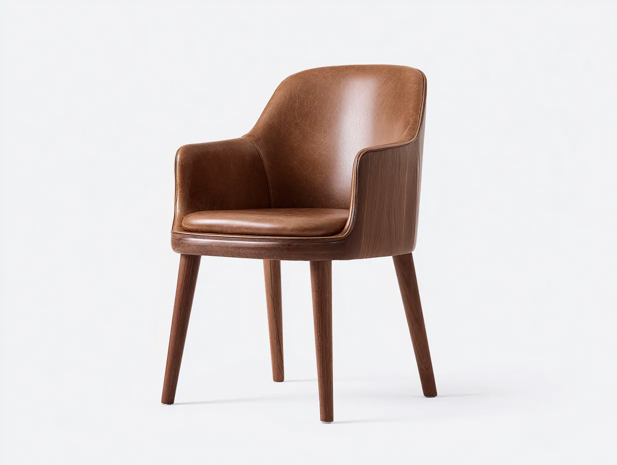 La struttura portante è realizzata in legno, selezionato per garantire solidità e stabilità. La seduta e lo schienale sono rivestiti in pelle sintetica di colore marrone, con una superficie uniforme e facile da mantenere. Le finiture sono curate per un aspetto ordinato e durevole.