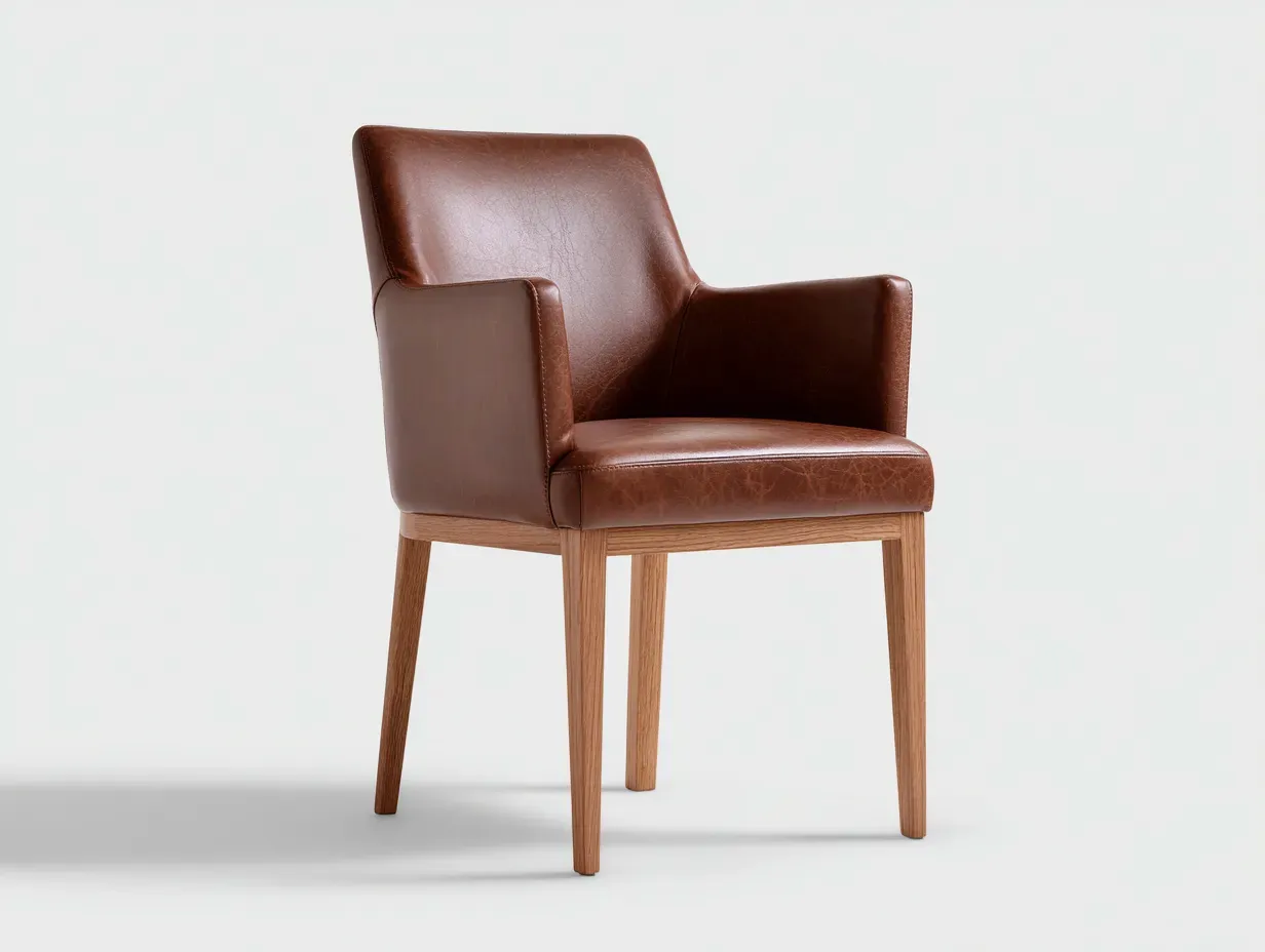La struttura è realizzata in legno, selezionato per assicurare solidità e affidabilità. Seduta, schienale e braccioli sono rivestiti in pelle sintetica di colore marrone, con superficie liscia e cuciture regolari. La lavorazione complessiva è curata per garantire una buona resistenza nel tempo.